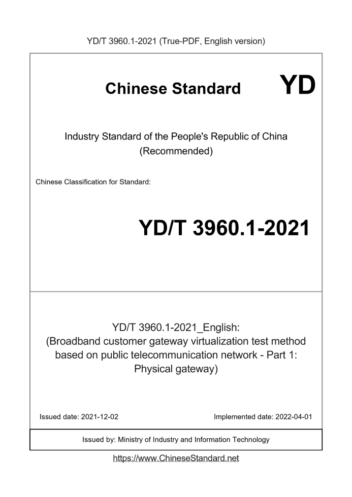 | YD/T 3960.1-2021 English PDFUS$1109.00 ยท In stock Delivery: <= 7 days. True-PDF full-copy in English will be manually translated and delivered via email. YD/T 3960.1-2021: (Broadband customer gateway virtualization test method based on public telecommunication network - Part 1: Physical gateway) Status: Valid