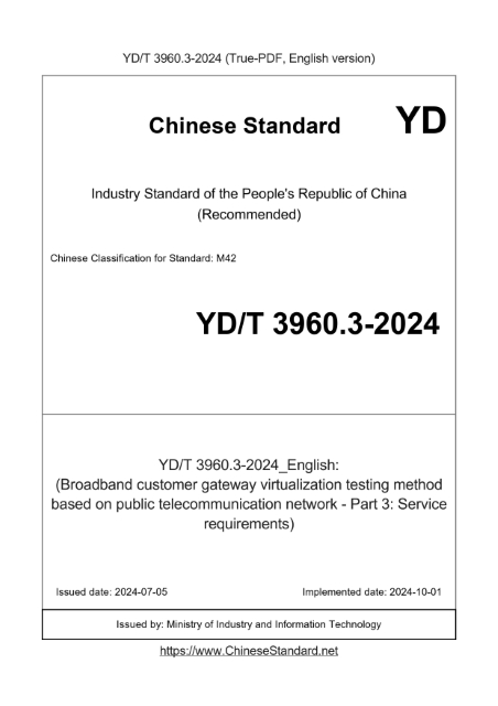 Basic dataStandard ID: YD/T 3960.3-2024 (YD/T3960.3-2024)Description (Translated English): (Broadband customer gateway virtualization testing method based on public telecommunication network - Part 3: Service requirements) Sector / Industry: Telecommunication Industry Standard (Recommended) Classification of Chinese Standard: M42 Classification of International Standard: 33.040.50 Date of Issue: 2024-07-05 Date of Implementation: 2024-10-01 Issuing agency(ies): Ministry of Industry and Information Technology Summary: This standard specifies all service test requirements provided by the virtualization architecture in the broadband customer gateway based on the public telecommunications network, including project test methods such as service management configuration test, basic service function test and value-added service function test. This standard applies to physical gateways, virtual gateways and corresponding service management platforms in the virtualization of broadband customer gateways based on public telecommunications networks. Tips & Frequently Asked Questions:Question 1: How long will the true-PDF of YD/T 3960.3-2024_English be delivered?Answer: Upon your order, we will start to translate YD/T 3960.3-2024_English as soon as possible, and keep you informed of the progress. The lead time is typically 1 ~ 3 working days. The lengthier the document the longer the lead time.Question 2: Can I share the purchased PDF of YD/T 3960.3-2024_English with my colleagues?Answer: Yes. The purchased PDF of YD/T 3960.3-2024_English will be deemed to be sold to your employer/organization who actually pays for it, including your colleagues and your employer's intranet.Question 3: Does the price include tax/VAT?Answer: Yes. Our tax invoice, downloaded/delivered in 9 seconds, includes all tax/VAT and complies with 100+ countries' tax regulations (tax exempted in 100+ countries) -- See Avoidance of Double Taxation Agreements (DTAs): List of DTAs signed between Singapore and 100+ countriesQuestion 4: Do you accept my currency other than USD?Answer: Yes. If you need your currency to be printed on the invoice, please write an email to Sales@ChineseStandard.net. In 2 working-hours, we will create a special link for you to pay in any currencies. Otherwise, follow the normal steps: Add to Cart -- Checkout -- Select your currency to pay. |