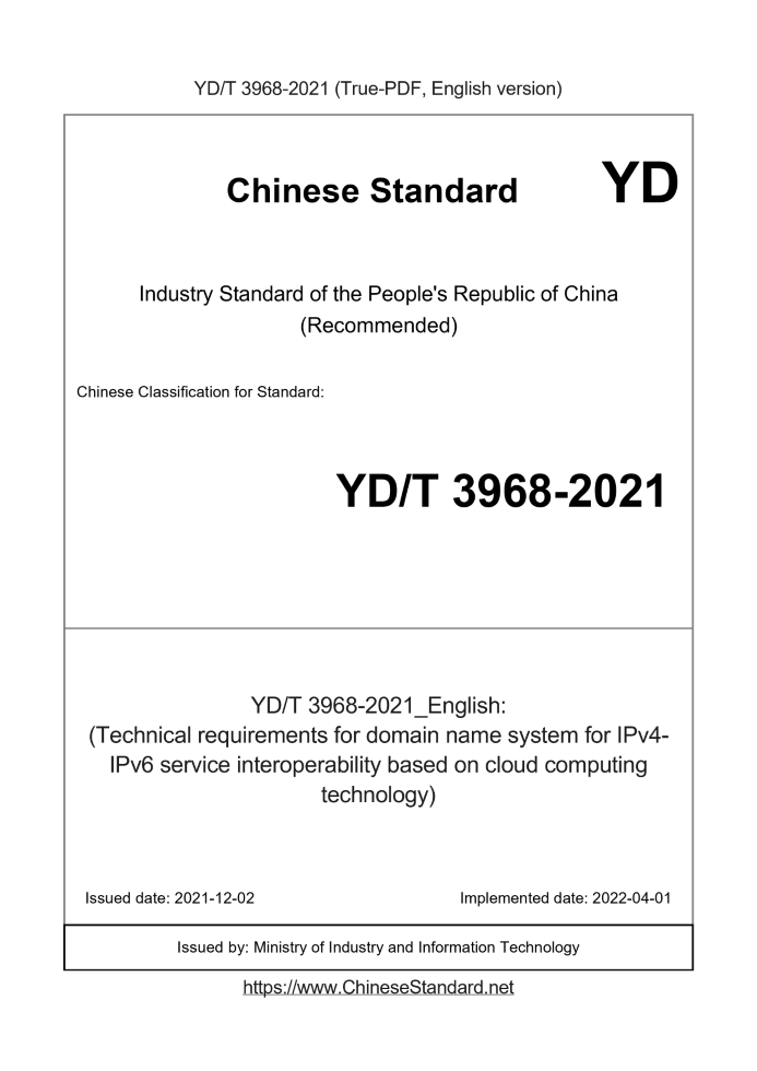 | YD/T 3968-2021 English PDFUS$259.00 ยท In stock Delivery: <= 3 days. True-PDF full-copy in English will be manually translated and delivered via email. YD/T 3968-2021: (Technical requirements for domain name system for IPv4-IPv6 service interoperability based on cloud computing technology) Status: Valid