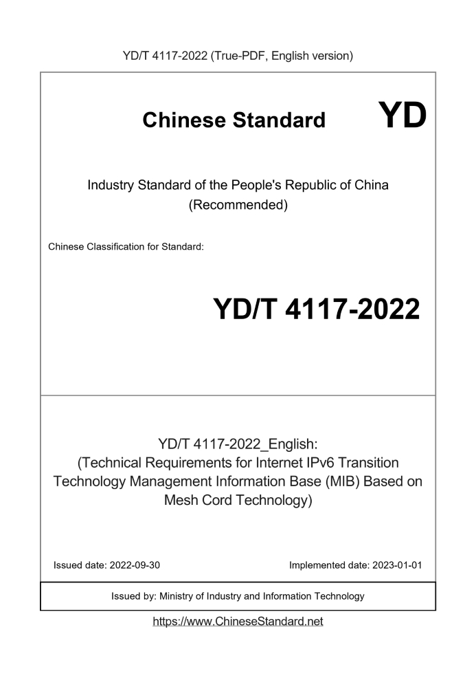 Delivery: <= 4 days. True-PDF full-copy in English will be manually translated and delivered via email. YD/T 4117-2022: (Technical Requirements for Internet IPv6 Transition Technology Management Information Base (MIB) Based on Mesh Cord Technology) Status: Valid