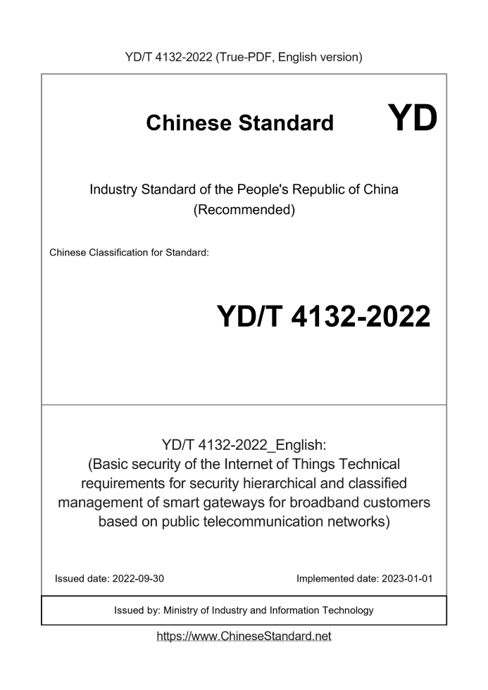 Delivery: <= 4 days. True-PDF full-copy in English will be manually translated and delivered via email. YD/T 4132-2022: (Basic security of the Internet of Things Technical requirements for security hierarchical and classified management of smart gateways for broadband customers based on public telecommunication networks) Status: Valid