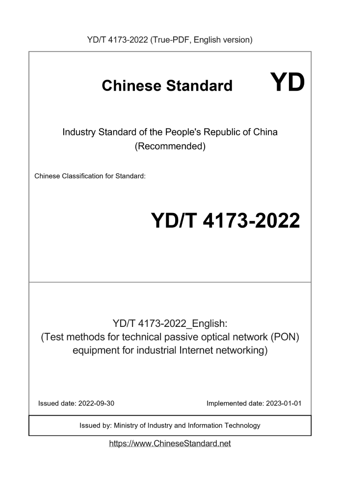 Delivery: <= 9 days. True-PDF full-copy in English will be manually translated and delivered via email. YD/T 4173-2022: (Test methods for technical passive optical network (PON) equipment for industrial Internet networking) Status: Valid
