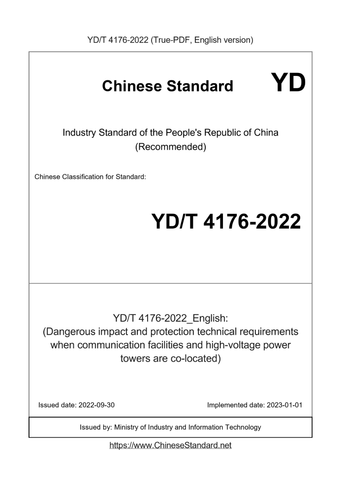 Delivery: <= 4 days. True-PDF full-copy in English will be manually translated and delivered via email. YD/T 4176-2022: (Dangerous impact and protection technical requirements when communication facilities and high-voltage power towers are co-located) Status: Valid