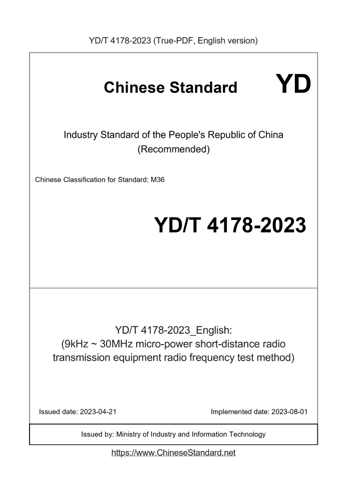 Delivery: <= 4 days. True-PDF full-copy in English will be manually translated and delivered via email. YD/T 4178-2023: (9kHz ~ 30MHz micro-power short-distance radio transmission equipment radio frequency test method) Status: Valid