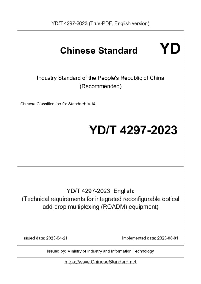 Basic dataStandard ID: YD/T 4297-2023 (YD/T4297-2023)Description (Translated English): (Technical requirements for integrated reconfigurable optical add-drop multiplexing (ROADM) equipment) Sector / Industry: Telecommunication Industry Standard (Recommended) Classification of Chinese Standard: M14 Classification of International Standard: 33.040.20 Date of Issue: 2023-04-21 Date of Implementation: 2023-08-01 Issuing agency(ies): Ministry of Industry and Information Technology Summary: This standard specifies the functions and performance of integrated reconfigurable optical add-drop multiplexing (ROADM) equipment, including the reference model and reference points, technical requirements, management requirements, etc. of integrated ROADM equipment. This standard applies to the design, production and operation of integrated reconfigurable optical add-drop multiplexing (ROADM) equipment. Tips & Frequently Asked Questions:Question 1: How long will the true-PDF of YD/T 4297-2023_English be delivered?Answer: Upon your order, we will start to translate YD/T 4297-2023_English as soon as possible, and keep you informed of the progress. The lead time is typically 1 ~ 3 working days. The lengthier the document the longer the lead time.Question 2: Can I share the purchased PDF of YD/T 4297-2023_English with my colleagues?Answer: Yes. The purchased PDF of YD/T 4297-2023_English will be deemed to be sold to your employer/organization who actually pays for it, including your colleagues and your employer's intranet.Question 3: Does the price include tax/VAT?Answer: Yes. Our tax invoice, downloaded/delivered in 9 seconds, includes all tax/VAT and complies with 100+ countries' tax regulations (tax exempted in 100+ countries) -- See Avoidance of Double Taxation Agreements (DTAs): List of DTAs signed between Singapore and 100+ countriesQuestion 4: Do you accept my currency other than USD?Answer: Yes. If you need your currency to be printed on the invoice, please write an email to Sales@ChineseStandard.net. In 2 working-hours, we will create a special link for you to pay in any currencies. Otherwise, follow the normal steps: Add to Cart -- Checkout -- Select your currency to pay. |