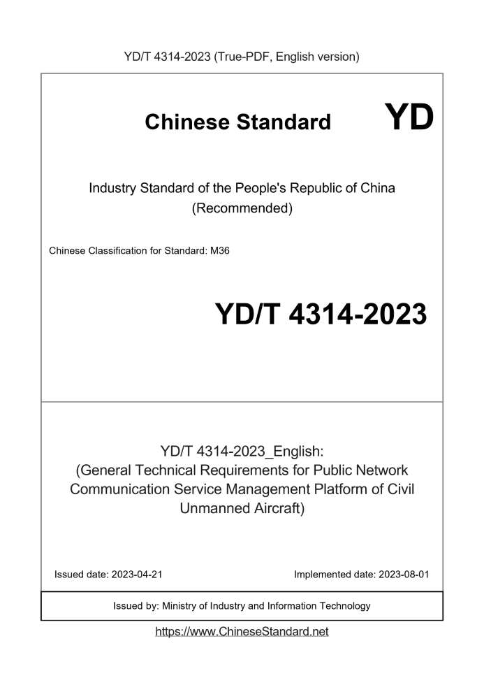 Basic dataStandard ID: YD/T 4314-2023 (YD/T4314-2023)Description (Translated English): (General Technical Requirements for Public Network Communication Service Management Platform of Civil Unmanned Aircraft) Sector / Industry: Telecommunication Industry Standard (Recommended) Classification of Chinese Standard: M36 Classification of International Standard: 33.060 Date of Issue: 2023-04-21 Date of Implementation: 2023-08-01 Issuing agency(ies): Ministry of Industry and Information Technology Summary: This standard specifies the system architecture, functional level requirements, external interfaces, and platform function and performance technical requirements for a civil unmanned aircraft service management platform based on public network communications. This standard applies to civil unmanned aircraft, but the flight monitoring and management of civil unmanned aircraft is outside the scope of this standard. |