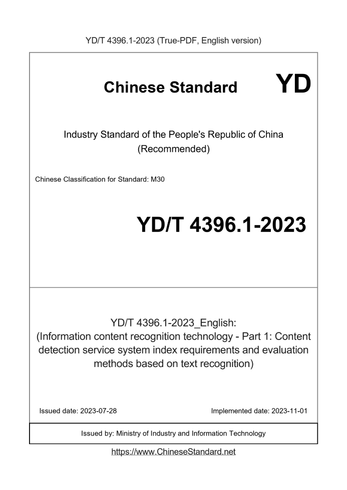 Basic dataStandard ID: YD/T 4396.1-2023 (YD/T4396.1-2023)Description (Translated English): (Information content recognition technology - Part 1: Content detection service system index requirements and evaluation methods based on text recognition) Sector / Industry: Telecommunication Industry Standard (Recommended) Classification of Chinese Standard: M30 Classification of International Standard: 33.160.60 Date of Issue: 2023-07-28 Date of Implementation: 2023-11-01 Issuing agency(ies): Ministry of Industry and Information Technology Summary: This standard specifies the basic information, system maturity, service quality index requirements and evaluation methods for material review and technical testing of content detection service systems based on text recognition. This standard is applicable to guide third-party evaluation agencies in the evaluation and acceptance of system manufacturers that provide content detection service systems based on text recognition. Tips & Frequently Asked Questions:Question 1: How long will the true-PDF of YD/T 4396.1-2023_English be delivered?Answer: Upon your order, we will start to translate YD/T 4396.1-2023_English as soon as possible, and keep you informed of the progress. The lead time is typically 1 ~ 3 working days. The lengthier the document the longer the lead time.Question 2: Can I share the purchased PDF of YD/T 4396.1-2023_English with my colleagues?Answer: Yes. The purchased PDF of YD/T 4396.1-2023_English will be deemed to be sold to your employer/organization who actually pays for it, including your colleagues and your employer's intranet.Question 3: Does the price include tax/VAT?Answer: Yes. Our tax invoice, downloaded/delivered in 9 seconds, includes all tax/VAT and complies with 100+ countries' tax regulations (tax exempted in 100+ countries) -- See Avoidance of Double Taxation Agreements (DTAs): List of DTAs signed between Singapore and 100+ countriesQuestion 4: Do you accept my currency other than USD?Answer: Yes. If you need your currency to be printed on the invoice, please write an email to Sales@ChineseStandard.net. In 2 working-hours, we will create a special link for you to pay in any currencies. Otherwise, follow the normal steps: Add to Cart -- Checkout -- Select your currency to pay. |