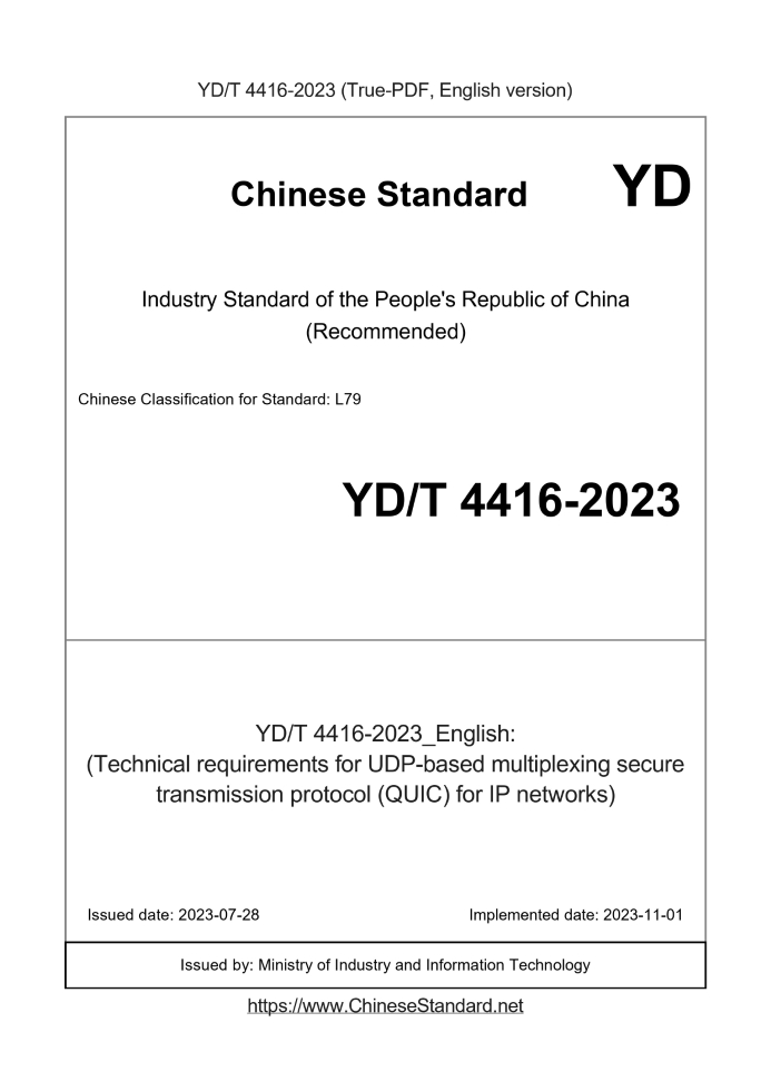 Basic dataStandard ID: YD/T 4416-2023 (YD/T4416-2023)Description (Translated English): (Technical requirements for UDP-based multiplexing secure transmission protocol (QUIC) for IP networks) Sector / Industry: Telecommunication Industry Standard (Recommended) Classification of Chinese Standard: L79 Classification of International Standard: 35.100.40 Date of Issue: 2023-07-28 Date of Implementation: 2023-11-01 Issuing agency(ies): Ministry of Industry and Information Technology Summary: This standard specifies the technical requirements for the multiplexed secure transmission protocol (QUIC) based on UDP in IP networks. The main contents include: QUIC basic structure and application mode, QUIC connection management, QUIC encapsulation structure, QUIC protocol state machine, QUIC version management , QUIC packet loss detection and congestion control, QUIC error handling mechanism, QUIC manageability technical requirements, QUIC application support technical requirements, QUIC performance requirements, QUIC encryption mechanism, QUIC security considerations, etc. This standard applies to the development of QUIC-based transport layer protocols. Tips & Frequently Asked Questions:Question 1: How long will the true-PDF of YD/T 4416-2023_English be delivered?Answer: Upon your order, we will start to translate YD/T 4416-2023_English as soon as possible, and keep you informed of the progress. The lead time is typically 1 ~ 3 working days. The lengthier the document the longer the lead time.Question 2: Can I share the purchased PDF of YD/T 4416-2023_English with my colleagues?Answer: Yes. The purchased PDF of YD/T 4416-2023_English will be deemed to be sold to your employer/organization who actually pays for it, including your colleagues and your employer's intranet.Question 3: Does the price include tax/VAT?Answer: Yes. Our tax invoice, downloaded/delivered in 9 seconds, includes all tax/VAT and complies with 100+ countries' tax regulations (tax exempted in 100+ countries) -- See Avoidance of Double Taxation Agreements (DTAs): List of DTAs signed between Singapore and 100+ countriesQuestion 4: Do you accept my currency other than USD?Answer: Yes. If you need your currency to be printed on the invoice, please write an email to Sales@ChineseStandard.net. In 2 working-hours, we will create a special link for you to pay in any currencies. Otherwise, follow the normal steps: Add to Cart -- Checkout -- Select your currency to pay. |