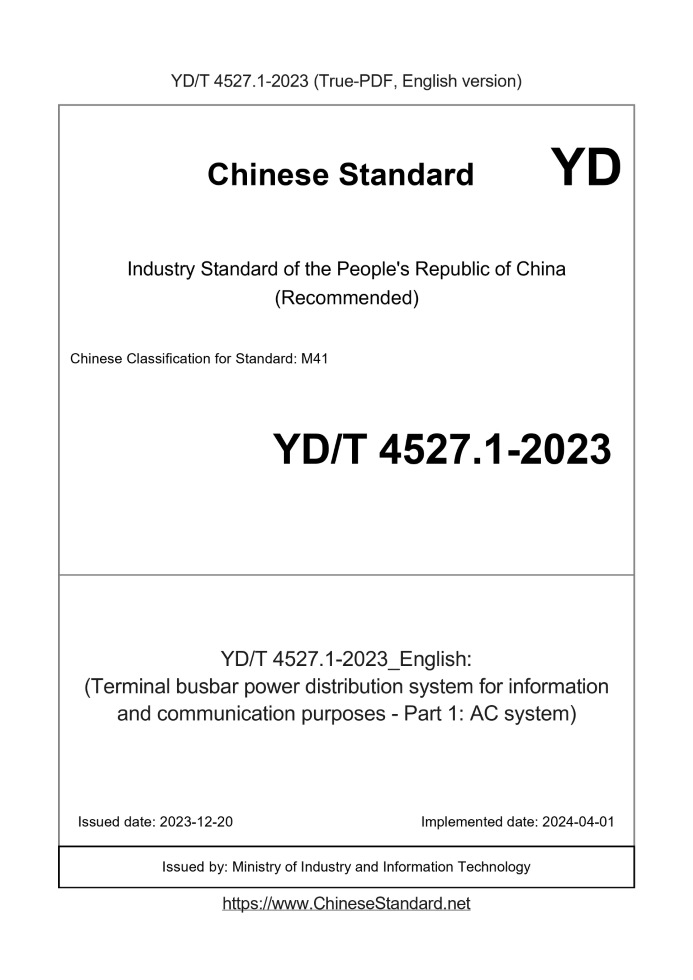 Basic dataStandard ID: YD/T 4527.1-2023 (YD/T4527.1-2023)Description (Translated English): (Terminal busbar power distribution system for information and communication purposes - Part 1: AC system) Sector / Industry: Telecommunication Industry Standard (Recommended) Classification of Chinese Standard: M41 Classification of International Standard: 29.200 Date of Issue: 2023-12-20 Date of Implementation: 2024-04-01 Issuing agency(ies): Ministry of Industry and Information Technology Summary: This standard specifies the composition and classification of AC systems, technical requirements, test methods, inspection rules, as well as marking, packaging, transportation and storage of terminal busbar power distribution systems for information communications. This standard applies to the design, manufacture, use and inspection of AC terminal busbar distribution systems. Tips & Frequently Asked Questions:Question 1: How long will the true-PDF of YD/T 4527.1-2023_English be delivered?Answer: Upon your order, we will start to translate YD/T 4527.1-2023_English as soon as possible, and keep you informed of the progress. The lead time is typically 1 ~ 3 working days. The lengthier the document the longer the lead time.Question 2: Can I share the purchased PDF of YD/T 4527.1-2023_English with my colleagues?Answer: Yes. The purchased PDF of YD/T 4527.1-2023_English will be deemed to be sold to your employer/organization who actually pays for it, including your colleagues and your employer's intranet.Question 3: Does the price include tax/VAT?Answer: Yes. Our tax invoice, downloaded/delivered in 9 seconds, includes all tax/VAT and complies with 100+ countries' tax regulations (tax exempted in 100+ countries) -- See Avoidance of Double Taxation Agreements (DTAs): List of DTAs signed between Singapore and 100+ countriesQuestion 4: Do you accept my currency other than USD?Answer: Yes. If you need your currency to be printed on the invoice, please write an email to Sales@ChineseStandard.net. In 2 working-hours, we will create a special link for you to pay in any currencies. Otherwise, follow the normal steps: Add to Cart -- Checkout -- Select your currency to pay. |