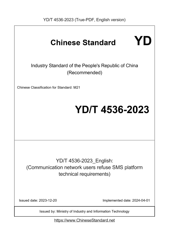Basic dataStandard ID: YD/T 4536-2023 (YD/T4536-2023)Description (Translated English): (Communication network users refuse SMS platform technical requirements) Sector / Industry: Telecommunication Industry Standard (Recommended) Classification of Chinese Standard: M21 Classification of International Standard: 33.030 Date of Issue: 2023-12-20 Date of Implementation: 2024-04-01 Issuing agency(ies): Ministry of Industry and Information Technology Summary: This standard stipulates the business framework, functions, processes and guarantee requirements for user rejection SMS platforms. This standard applies to the construction, operation and maintenance of user rejection SMS platform services. Tips & Frequently Asked Questions:Question 1: How long will the true-PDF of YD/T 4536-2023_English be delivered?Answer: Upon your order, we will start to translate YD/T 4536-2023_English as soon as possible, and keep you informed of the progress. The lead time is typically 1 ~ 3 working days. The lengthier the document the longer the lead time.Question 2: Can I share the purchased PDF of YD/T 4536-2023_English with my colleagues?Answer: Yes. The purchased PDF of YD/T 4536-2023_English will be deemed to be sold to your employer/organization who actually pays for it, including your colleagues and your employer's intranet.Question 3: Does the price include tax/VAT?Answer: Yes. Our tax invoice, downloaded/delivered in 9 seconds, includes all tax/VAT and complies with 100+ countries' tax regulations (tax exempted in 100+ countries) -- See Avoidance of Double Taxation Agreements (DTAs): List of DTAs signed between Singapore and 100+ countriesQuestion 4: Do you accept my currency other than USD?Answer: Yes. If you need your currency to be printed on the invoice, please write an email to Sales@ChineseStandard.net. In 2 working-hours, we will create a special link for you to pay in any currencies. Otherwise, follow the normal steps: Add to Cart -- Checkout -- Select your currency to pay. |