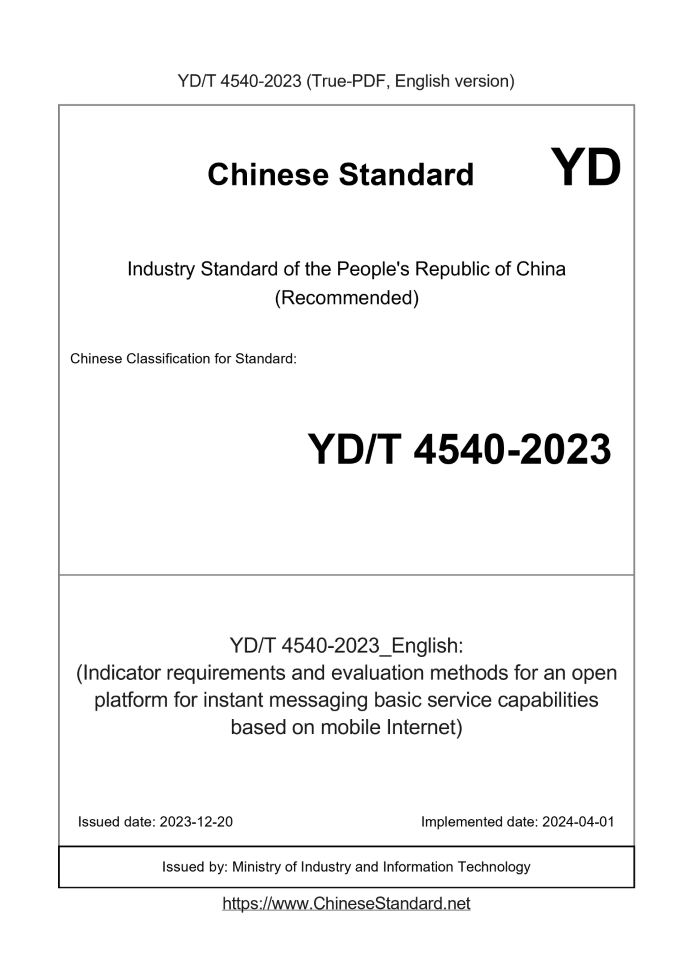 Basic dataStandard ID: YD/T 4540-2023 (YD/T4540-2023)Description (Translated English): (Indicator requirements and evaluation methods for an open platform for instant messaging basic service capabilities based on mobile Internet) Sector / Industry: Telecommunication Industry Standard (Recommended) Classification of International Standard: 33.030 Date of Issue: 2023-12-20 Date of Implementation: 2024-04-01 Issuing agency(ies): Ministry of Industry and Information Technology Summary: This standard specifies the system architecture of an open platform for instant messaging basic service capabilities based on the mobile Internet, and specifies relevant index requirements and evaluation methods in terms of functions, performance, reliability, and security. This standard applies to the evaluation and acceptance of instant messaging basic service capability open platform products. Tips & Frequently Asked Questions:Question 1: How long will the true-PDF of YD/T 4540-2023_English be delivered?Answer: Upon your order, we will start to translate YD/T 4540-2023_English as soon as possible, and keep you informed of the progress. The lead time is typically 1 ~ 3 working days. The lengthier the document the longer the lead time.Question 2: Can I share the purchased PDF of YD/T 4540-2023_English with my colleagues?Answer: Yes. The purchased PDF of YD/T 4540-2023_English will be deemed to be sold to your employer/organization who actually pays for it, including your colleagues and your employer's intranet.Question 3: Does the price include tax/VAT?Answer: Yes. Our tax invoice, downloaded/delivered in 9 seconds, includes all tax/VAT and complies with 100+ countries' tax regulations (tax exempted in 100+ countries) -- See Avoidance of Double Taxation Agreements (DTAs): List of DTAs signed between Singapore and 100+ countriesQuestion 4: Do you accept my currency other than USD?Answer: Yes. If you need your currency to be printed on the invoice, please write an email to Sales@ChineseStandard.net. In 2 working-hours, we will create a special link for you to pay in any currencies. Otherwise, follow the normal steps: Add to Cart -- Checkout -- Select your currency to pay. |
