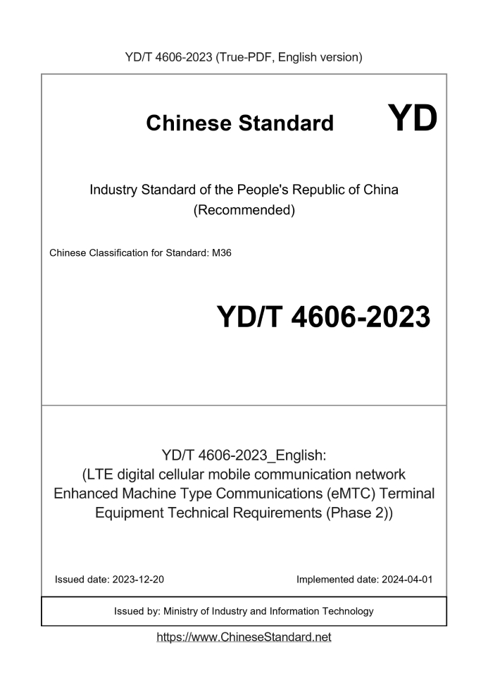 Basic dataStandard ID: YD/T 4606-2023 (YD/T4606-2023)Description (Translated English): (LTE digital cellular mobile communication network Enhanced Machine Type Communications (eMTC) Terminal Equipment Technical Requirements (Phase 2)) Sector / Industry: Telecommunication Industry Standard (Recommended) Classification of Chinese Standard: M36 Classification of International Standard: 33.060.99 Date of Issue: 2023-12-20 Date of Implementation: 2024-04-01 Issuing agency(ies): Ministry of Industry and Information Technology Summary: This standard specifies the functional requirements, performance requirements and interface requirements for machine type communications (eMTC) terminal equipment based on LTE evolution. This standard applies to the design and application of technical requirements (Phase 2) for enhanced machine type communications (eMTC) terminal equipment. Tips & Frequently Asked Questions:Question 1: How long will the true-PDF of YD/T 4606-2023_English be delivered?Answer: Upon your order, we will start to translate YD/T 4606-2023_English as soon as possible, and keep you informed of the progress. The lead time is typically 1 ~ 3 working days. The lengthier the document the longer the lead time.Question 2: Can I share the purchased PDF of YD/T 4606-2023_English with my colleagues?Answer: Yes. The purchased PDF of YD/T 4606-2023_English will be deemed to be sold to your employer/organization who actually pays for it, including your colleagues and your employer's intranet.Question 3: Does the price include tax/VAT?Answer: Yes. Our tax invoice, downloaded/delivered in 9 seconds, includes all tax/VAT and complies with 100+ countries' tax regulations (tax exempted in 100+ countries) -- See Avoidance of Double Taxation Agreements (DTAs): List of DTAs signed between Singapore and 100+ countriesQuestion 4: Do you accept my currency other than USD?Answer: Yes. If you need your currency to be printed on the invoice, please write an email to Sales@ChineseStandard.net. In 2 working-hours, we will create a special link for you to pay in any currencies. Otherwise, follow the normal steps: Add to Cart -- Checkout -- Select your currency to pay. |