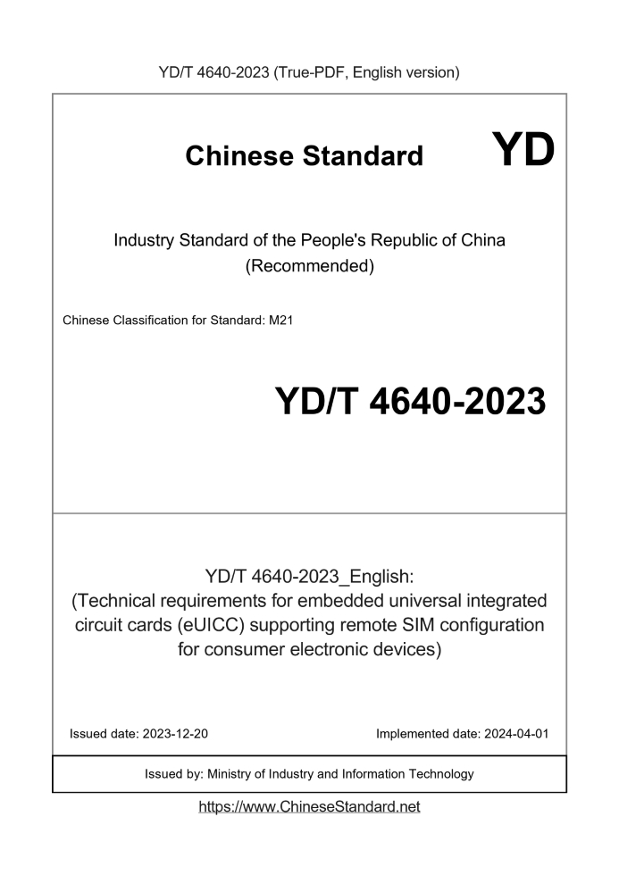 Basic dataStandard ID: YD/T 4640-2023 (YD/T4640-2023)Description (Translated English): (Technical requirements for embedded universal integrated circuit cards (eUICC) supporting remote SIM configuration for consumer electronic devices) Sector / Industry: Telecommunication Industry Standard (Recommended) Classification of Chinese Standard: M21 Classification of International Standard: 33.030 Date of Issue: 2023-12-20 Date of Implementation: 2024-04-01 Issuing agency(ies): Ministry of Industry and Information Technology Summary: This standard specifies the card structure and general requirements for embedded UICCs that support remote SIM configuration for consumer electronics devices. It specifies the policy management requirements and security requirements related to embedded UICCs for consumer electronics devices. It defines the relationship between embedded UICCs and SM- Interface requirements between DP+ and MNO. This standard applies to the design, development and testing of embedded UICCs in the field of consumer electronics. Tips & Frequently Asked Questions:Question 1: How long will the true-PDF of YD/T 4640-2023_English be delivered?Answer: Upon your order, we will start to translate YD/T 4640-2023_English as soon as possible, and keep you informed of the progress. The lead time is typically 1 ~ 3 working days. The lengthier the document the longer the lead time.Question 2: Can I share the purchased PDF of YD/T 4640-2023_English with my colleagues?Answer: Yes. The purchased PDF of YD/T 4640-2023_English will be deemed to be sold to your employer/organization who actually pays for it, including your colleagues and your employer's intranet.Question 3: Does the price include tax/VAT?Answer: Yes. Our tax invoice, downloaded/delivered in 9 seconds, includes all tax/VAT and complies with 100+ countries' tax regulations (tax exempted in 100+ countries) -- See Avoidance of Double Taxation Agreements (DTAs): List of DTAs signed between Singapore and 100+ countriesQuestion 4: Do you accept my currency other than USD?Answer: Yes. If you need your currency to be printed on the invoice, please write an email to Sales@ChineseStandard.net. In 2 working-hours, we will create a special link for you to pay in any currencies. Otherwise, follow the normal steps: Add to Cart -- Checkout -- Select your currency to pay. |