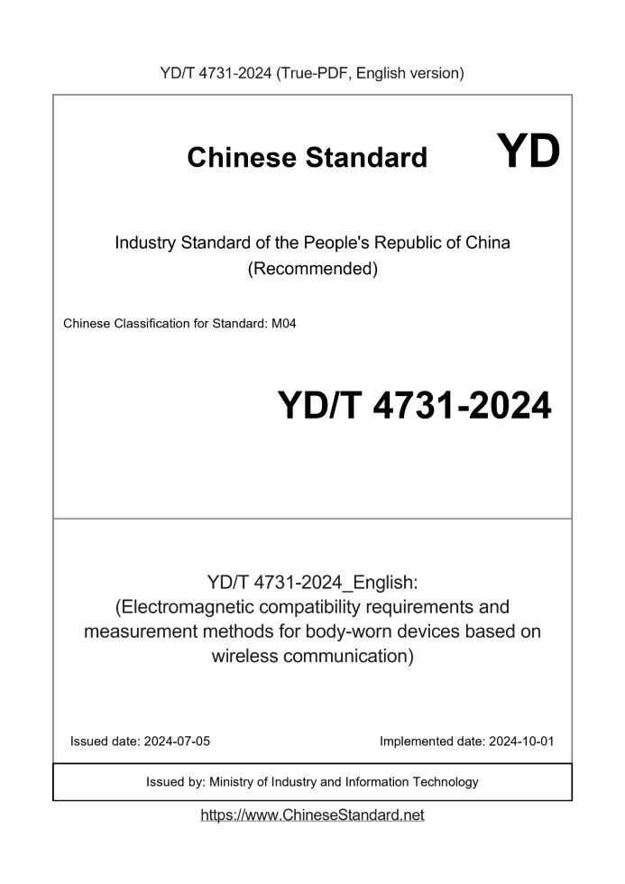 | YD/T 4731-2024 | English | RFQ | ASK | 3 days [Need to translate] | (Electromagnetic compatibility requirements and measurement methods for body-worn devices based on wireless communication) |
