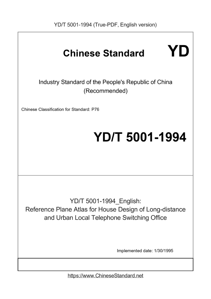 Basic dataStandard ID: YD/T 5001-1994 (YD/T5001-1994)Description (Translated English): Reference Plane Atlas for House Design of Long-distance and Urban Local Telephone Switching Office Sector / Industry: Telecommunication Industry Standard (Recommended) Classification of Chinese Standard: P76 Word Count Estimation: 89,838 Date of Implementation: 1/30/1995 Summary: This standard applies to new regional centers over long, city (in building) room Graphic Design Bureau and the Central Office of the construction, renovation, expansion project, the Housing Authority should expand the rational use of existing installed capacity, with reference to the design of the atlas. Tips & Frequently Asked Questions:Question 1: How long will the true-PDF of YD/T 5001-1994_English be delivered?Answer: Upon your order, we will start to translate YD/T 5001-1994_English as soon as possible, and keep you informed of the progress. The lead time is typically 9 ~ 13 working days. The lengthier the document the longer the lead time.Question 2: Can I share the purchased PDF of YD/T 5001-1994_English with my colleagues?Answer: Yes. The purchased PDF of YD/T 5001-1994_English will be deemed to be sold to your employer/organization who actually pays for it, including your colleagues and your employer's intranet.Question 3: Does the price include tax/VAT?Answer: Yes. Our tax invoice, downloaded/delivered in 9 seconds, includes all tax/VAT and complies with 100+ countries' tax regulations (tax exempted in 100+ countries) -- See Avoidance of Double Taxation Agreements (DTAs): List of DTAs signed between Singapore and 100+ countriesQuestion 4: Do you accept my currency other than USD?Answer: Yes. If you need your currency to be printed on the invoice, please write an email to Sales@ChineseStandard.net. In 2 working-hours, we will create a special link for you to pay in any currencies. Otherwise, follow the normal steps: Add to Cart -- Checkout -- Select your currency to pay. |