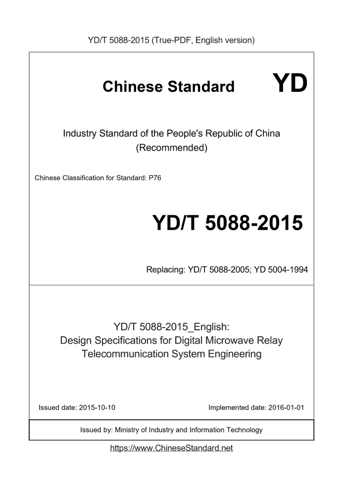 Delivery: <= 10 days. True-PDF full-copy in English will be manually translated and delivered via email. YD/T 5088-2015: Design Specifications for Digital Microwave Relay Telecommunication System Engineering Status: Valid YD/T 5088: Historical versions