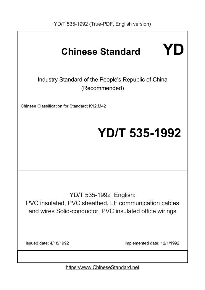 Delivery: <= 4 days. True-PDF full-copy in English will be manually translated and delivered via email. YD/T 535-1992: PVC insulated, PVC sheathed, LF communication cables and wires Solid-conductor, PVC insulated office wirings Status: Obsolete