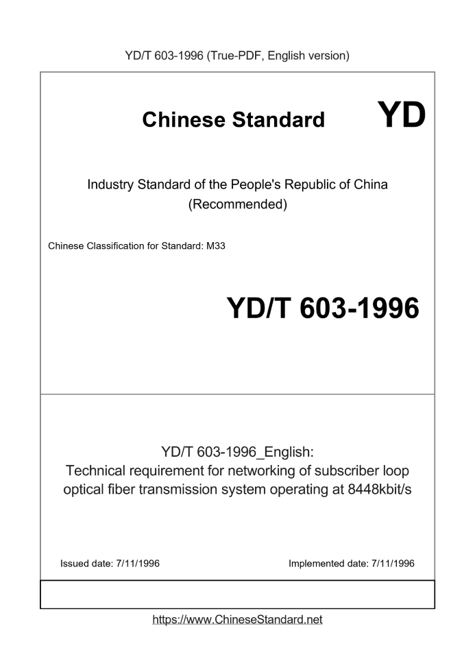 Delivery: <= 4 days. True-PDF full-copy in English will be manually translated and delivered via email. YD/T 603-1996: Technical requirement for networking of subscriber loop optical fiber transmission system operating at 8448kbit/s Status: Obsolete