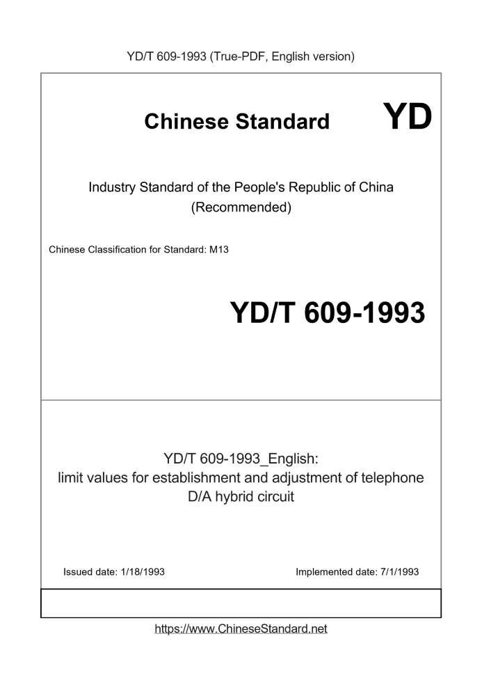 Delivery: <= 4 days. True-PDF full-copy in English will be manually translated and delivered via email. YD/T 609-1993: limit values for establishment and adjustment of telephone D/A hybrid circuit Status: Obsolete