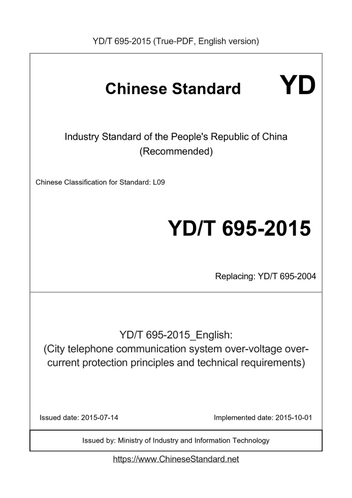 YD/T 695-2015279 Add to Cart 3 days (City telephone communication system over-voltage over-current protection principles and technical requirements) Valid