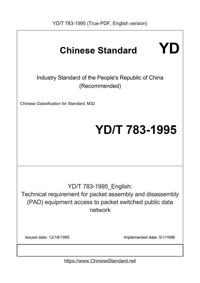Delivery: <= 3 days. True-PDF full-copy in English will be manually translated and delivered via email. YD/T 783-1995: Technical requirement for packet assembly and disassembly (PAD) equipment access to packet switched public data network Status: Obsolete