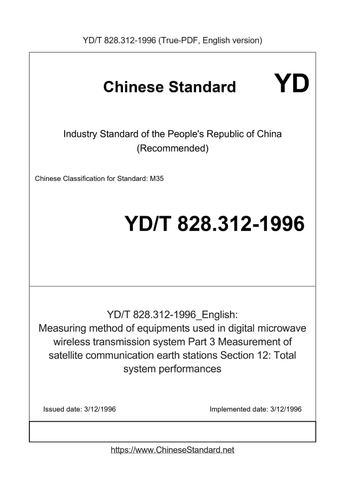 Delivery: <= 3 days. True-PDF full-copy in English will be manually translated and delivered via email. YD/T 828.312-1996: Measuring method of equipments used in digital microwave wireless transmission system Part 3 Measurement of satellite communication earth stations Section 12: Total system performances Status: Obsolete