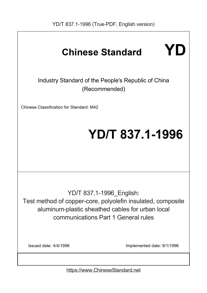 Delivery: <= 2 days. True-PDF full-copy in English will be manually translated and delivered via email. YD/T 837.1-1996: Test method of copper-core, polyolefin insulated, composite aluminum-plastic sheathed cables for urban local communications Part 1 General rules