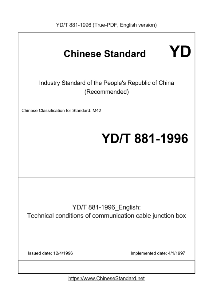 Delivery: <= 3 days. True-PDF full-copy in English will be manually translated and delivered via email. YD/T 881-1996: Technical conditions of communication cable junction box