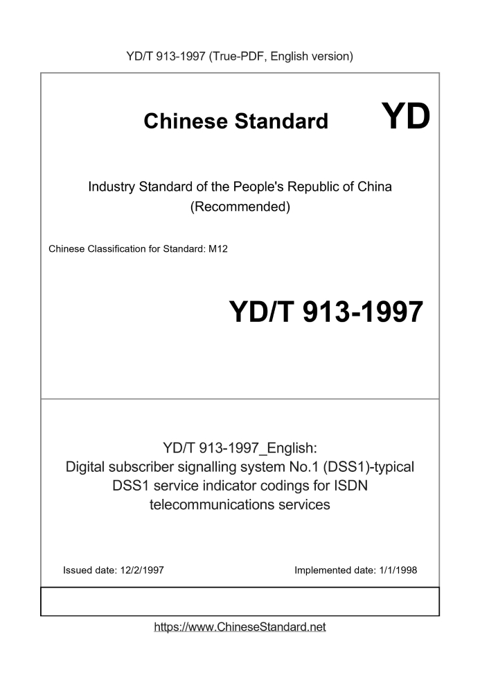 Delivery: <= 8 days. True-PDF full-copy in English will be manually translated and delivered via email. YD/T 913-1997: Digital subscriber signalling system No.1 (DSS1)-typical DSS1 service indicator codings for ISDN telecommunications services