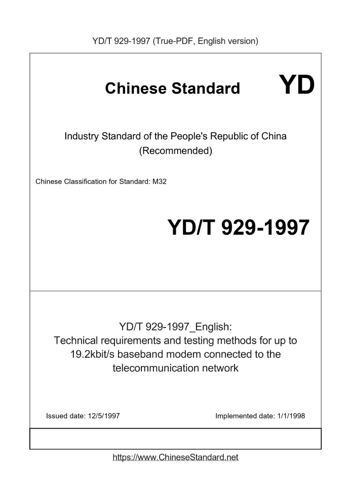 Delivery: <= 3 days. True-PDF full-copy in English will be manually translated and delivered via email. YD/T 929-1997: Technical requirements and testing methods for up to 19.2kbit/s baseband modem connected to the telecommunication network