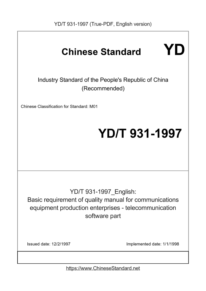 Delivery: <= 4 days. True-PDF full-copy in English will be manually translated and delivered via email. YD/T 931-1997: Basic requirement of quality manual for communications equipment production enterprises - telecommunication software part Status: Obsolete