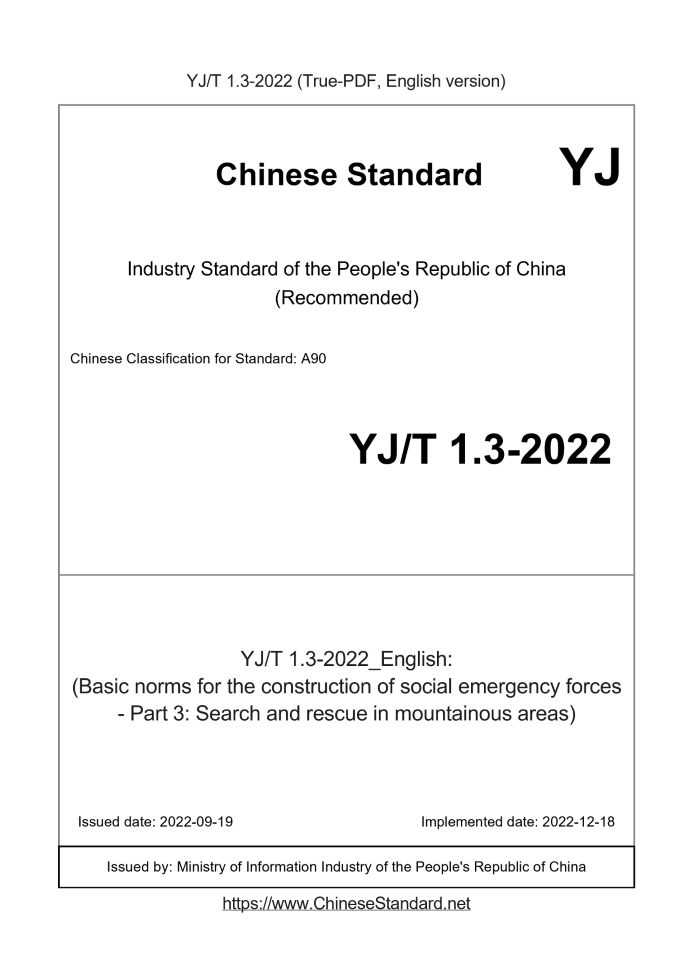 Delivery: <= 5 days. True-PDF full-copy in English will be manually translated and delivered via email. YJT1.3-2022: (Basic norms for the construction of social emergency forces - Part 3: Search and rescue in mountainous areas) Status: Valid