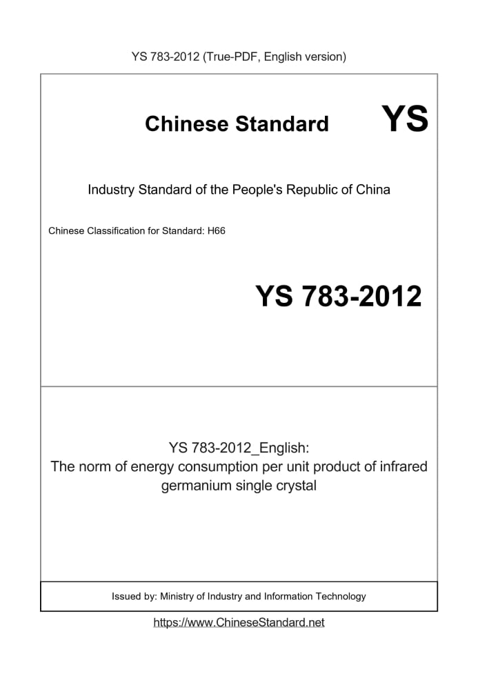 Delivery: <= 3 days. True-PDF full-copy in English will be manually translated and delivered via email. YS 783-2012: The norm of energy consumption per unit product of infrared germanium single crystal Status: Valid