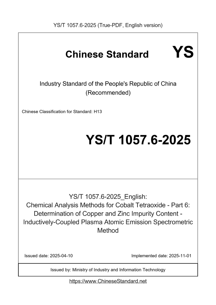 Basic dataStandard ID: YS/T 1057.6-2025 (YS/T1057.6-2025)Description (Translated English): Chemical Analysis Methods for Cobalt Tetraoxide - Part 6: Determination of Copper and Zinc Impurity Content - Inductively-Coupled Plasma Atomic Emission Spectrometric Method Sector / Industry: Nonferrous Metallurgy Industry Standard (Recommended) Classification of Chinese Standard: H13 Classification of International Standard: 77.120.70 Date of Issue: 2025-04-10 Date of Implementation: 2025-11-01 Issuing agency(ies): Ministry of Industry and Information Technology Summary: This standard specifies the method for determining the copper-zinc foreign matter content in cobalt tetroxide. This document applies to the determination of the copper-zinc foreign matter content in cobalt tetroxide, with a determination range of 5 mg/kg to 400 mg/kg. Tips & Frequently Asked Questions:Question 1: How long will the true-PDF of YS/T 1057.6-2025_English be delivered?Answer: Upon your order, we will start to translate YS/T 1057.6-2025_English as soon as possible, and keep you informed of the progress. The lead time is typically 1 ~ 3 working days. The lengthier the document the longer the lead time.Question 2: Can I share the purchased PDF of YS/T 1057.6-2025_English with my colleagues?Answer: Yes. The purchased PDF of YS/T 1057.6-2025_English will be deemed to be sold to your employer/organization who actually pays for it, including your colleagues and your employer's intranet.Question 3: Does the price include tax/VAT?Answer: Yes. Our tax invoice, downloaded/delivered in 9 seconds, includes all tax/VAT and complies with 100+ countries' tax regulations (tax exempted in 100+ countries) -- See Avoidance of Double Taxation Agreements (DTAs): List of DTAs signed between Singapore and 100+ countriesQuestion 4: Do you accept my currency other than USD?Answer: Yes. If you need your currency to be printed on the invoice, please write an email to Sales@ChineseStandard.net. In 2 working-hours, we will create a special link for you to pay in any currencies. Otherwise, follow the normal steps: Add to Cart -- Checkout -- Select your currency to pay. |