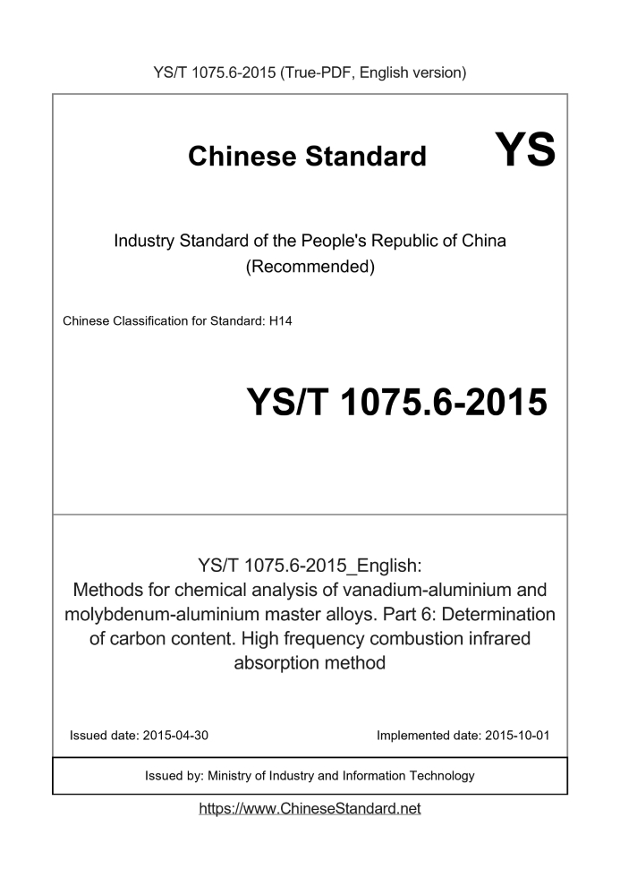 Delivery: <= 3 days. True-PDF full-copy in English will be manually translated and delivered via email. YS/T 1075.6-2015: Methods for chemical analysis of vanadium-aluminium and molybdenum-aluminium master alloys. Part 6: Determination of carbon content. High frequency combustion infrared absorption method Status: Valid
