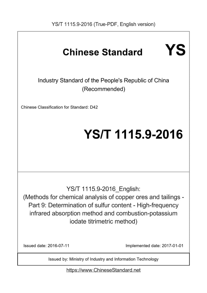 Delivery: <= 3 days. True-PDF full-copy in English will be manually translated and delivered via email. YS/T 1115.9-2016: (Methods for chemical analysis of copper ores and tailings - Part 9: Determination of sulfur content - High-frequency infrared absorption method and combustion-potassium iodate titrimetric method) Status: Valid