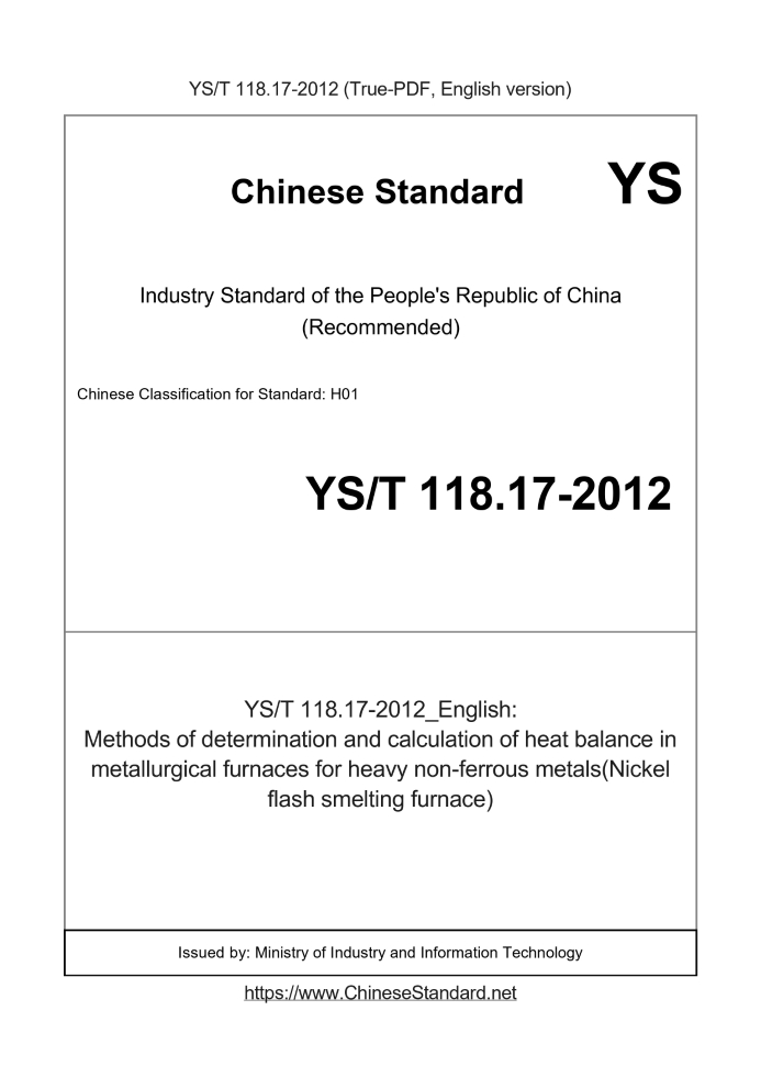 Delivery: <= 4 days. True-PDF full-copy in English will be manually translated and delivered via email. YS/T 118.17-2012: Methods of determination and calculation of heat balance in metallurgical furnaces for heavy non-ferrous metals(Nickel flash smelting furnace) Status: Valid