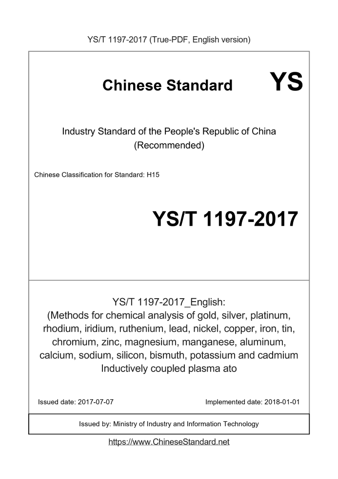 Delivery: <= 3 days. True-PDF full-copy in English will be manually translated and delivered via email. YS/T 1197-2017: (Methods for chemical analysis of gold, silver, platinum, rhodium, iridium, ruthenium, lead, nickel, copper, iron, tin, chromium, zinc, magnesium, manganese, aluminum, calcium, sodium, silicon, bismuth, potassium and cadmium Inductively coupled plasma ato Status: Valid