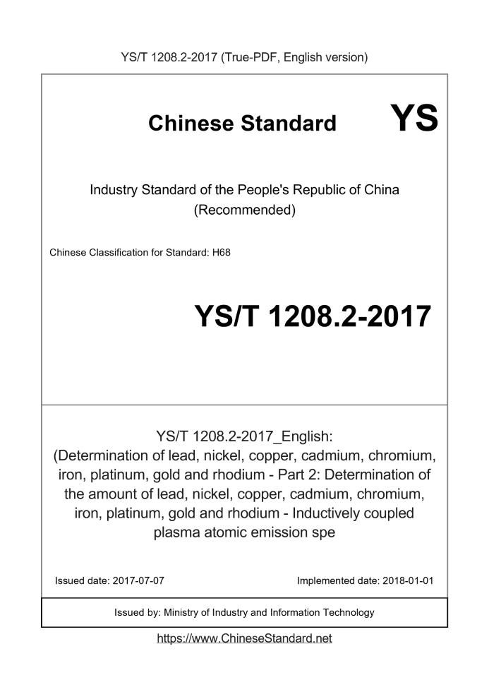 Delivery: <= 3 days. True-PDF full-copy in English will be manually translated and delivered via email. YS/T 1208.2-2017: (Determination of lead, nickel, copper, cadmium, chromium, iron, platinum, gold and rhodium - Part 2: Determination of the amount of lead, nickel, copper, cadmium, chromium, iron, platinum, gold and rhodium - Inductively coupled plasma atomic emission spe Status: Valid