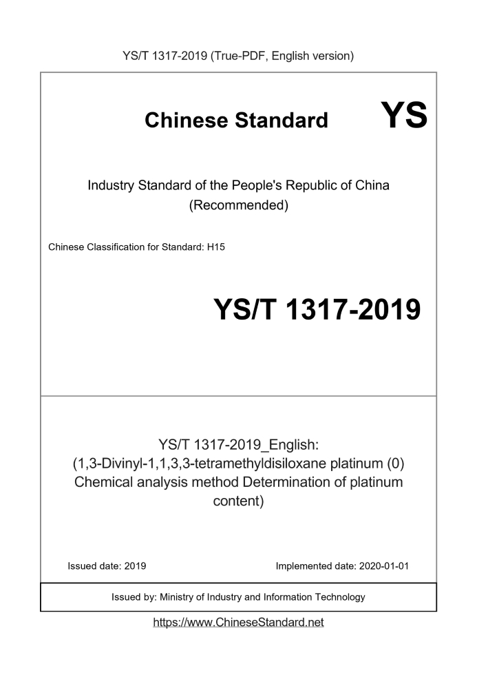 Delivery: <= 3 days. True-PDF full-copy in English will be manually translated and delivered via email. YS/T 1317-2019: (1,3-Divinyl-1,1,3,3-tetramethyldisiloxane platinum (0) Chemical analysis method Determination of platinum content) Status: Valid