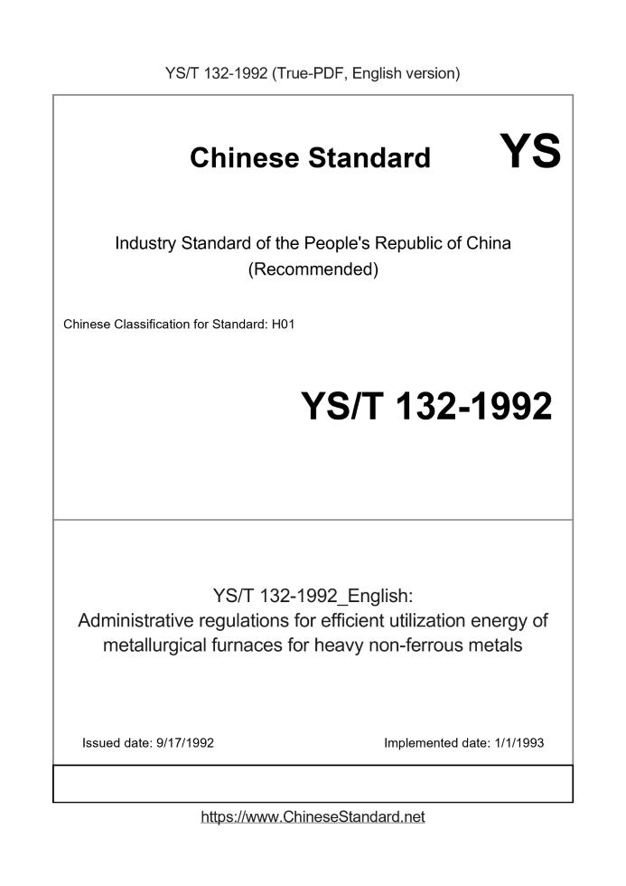 Delivery: <= 3 days. True-PDF full-copy in English will be manually translated and delivered via email. YS/T 132-1992: Administrative regulations for efficient utilization energy of metallurgical furnaces for heavy non-ferrous metals Status: Obsolete