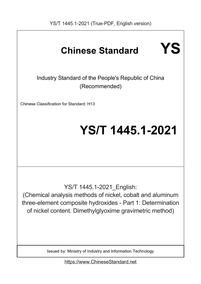 Delivery: <= 3 days. True-PDF full-copy in English will be manually translated and delivered via email. YS/T 1445.1-2021: (Chemical analysis methods of nickel, cobalt and aluminum three-element composite hydroxides - Part 1: Determination of nickel content. Dimethylglyoxime gravimetric method) Status: Valid