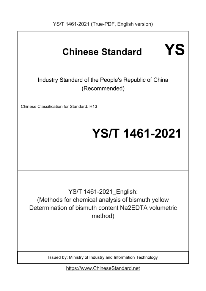 Delivery: <= 3 days. True-PDF full-copy in English will be manually translated and delivered via email. YS/T 1461-2021: (Methods for chemical analysis of bismuth yellow Determination of bismuth content Na2EDTA volumetric method) Status: Valid