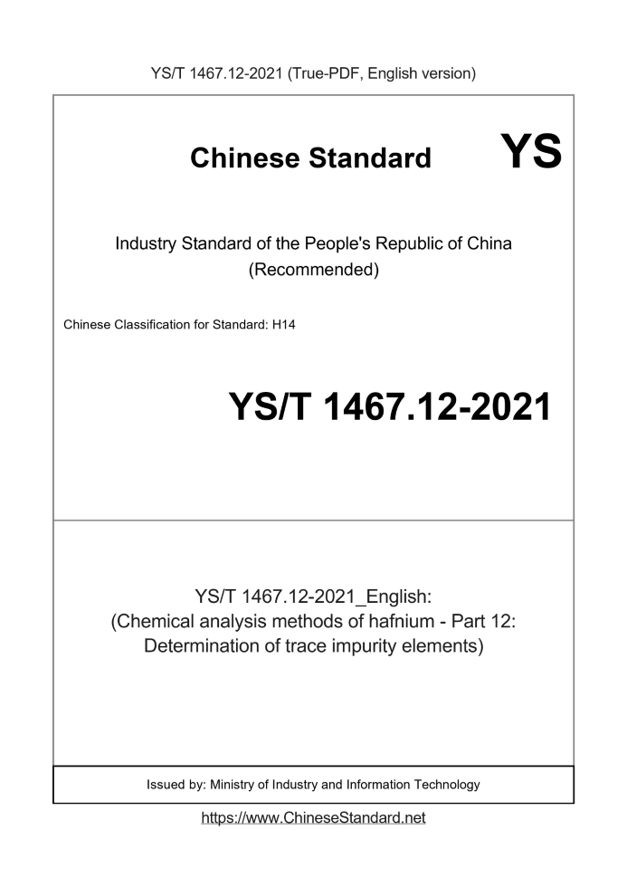Delivery: <= 3 days. True-PDF full-copy in English will be manually translated and delivered via email. YS/T 1467.12-2021: (Chemical analysis methods of hafnium - Part 12: Determination of trace impurity elements) Status: Valid