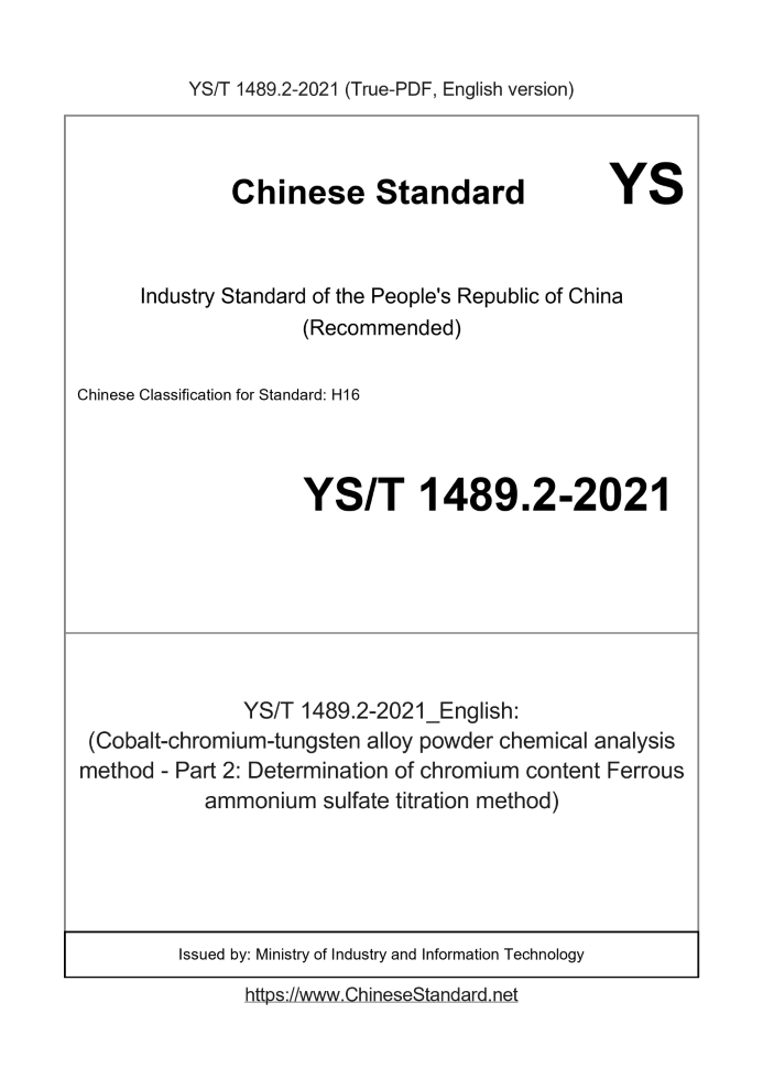 Delivery: <= 3 days. True-PDF full-copy in English will be manually translated and delivered via email. YS/T 1489.2-2021: (Cobalt-chromium-tungsten alloy powder chemical analysis method - Part 2: Determination of chromium content Ferrous ammonium sulfate titration method) Status: Valid