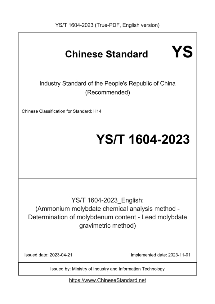 Delivery: <= 3 days. True-PDF full-copy in English will be manually translated and delivered via email. YS/T 1604-2023: (Ammonium molybdate chemical analysis method - Determination of molybdenum content - Lead molybdate gravimetric method) Status: Valid