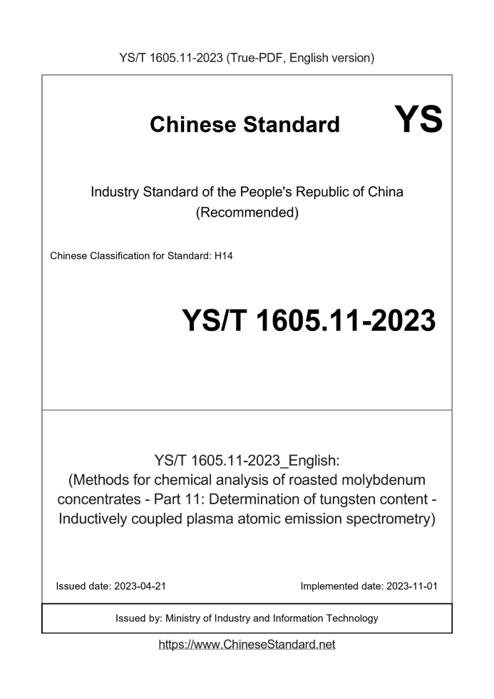 Delivery: <= 3 days. True-PDF full-copy in English will be manually translated and delivered via email. YS/T 1605.11-2023: (Methods for chemical analysis of roasted molybdenum concentrates - Part 11: Determination of tungsten content - Inductively coupled plasma atomic emission spectrometry) Status: Valid