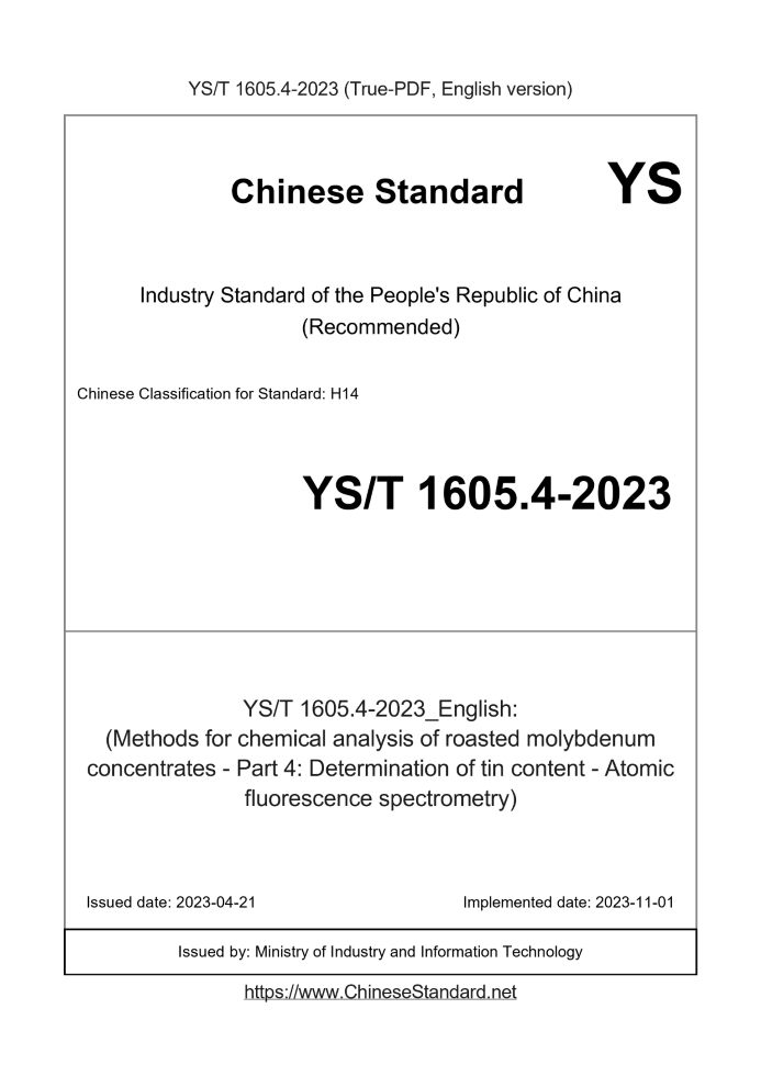 Delivery: <= 3 days. True-PDF full-copy in English will be manually translated and delivered via email. YS/T 1605.4-2023: (Methods for chemical analysis of roasted molybdenum concentrates - Part 4: Determination of tin content - Atomic fluorescence spectrometry) Status: Valid