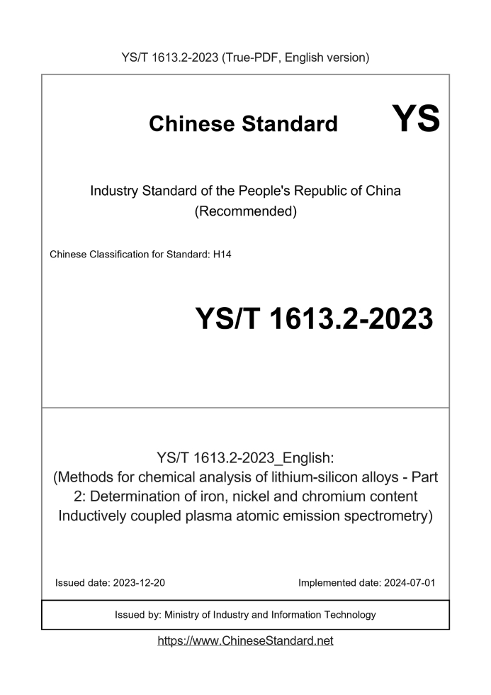 Delivery: <= 3 days. True-PDF full-copy in English will be manually translated and delivered via email. YS/T 1613.2-2023: (Methods for chemical analysis of lithium-silicon alloys - Part 2: Determination of iron, nickel and chromium content Inductively coupled plasma atomic emission spectrometry) Status: Valid
