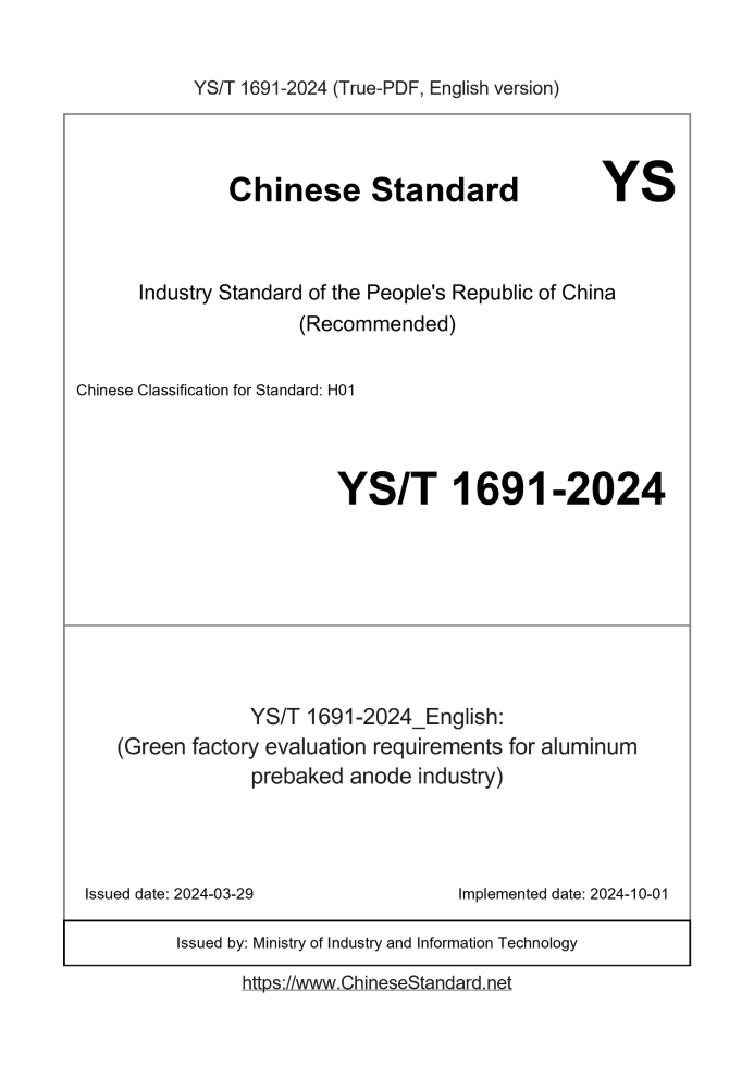Delivery: <= 4 days. True-PDF full-copy in English will be manually translated and delivered via email. YS/T 1691-2024: (Green factory evaluation requirements for aluminum prebaked anode industry) Status: Valid
